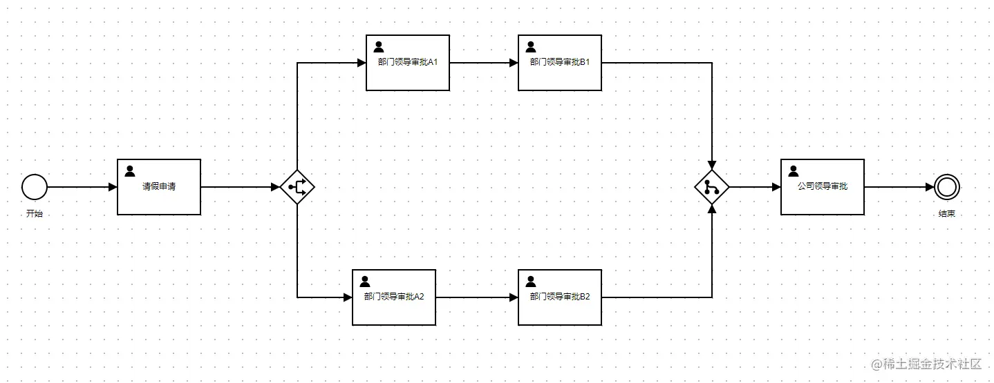 前面讲到的条件流程执行是通过调整决策节点的执行逻辑来实现的,那分支与合并流程呢?我们又应该如何去处理其执行逻辑呢?下面我们来看一条存在有分支与合并的简单流程。如下图: 请假申请->部门领导审批(多领导并行)->公司领导审批